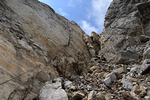 neben grobem Geröll geradewegs höher (I, Drahtseil, s.