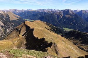 am Allgäuer Hauptkamm im Westen. Links zieht das Tal des