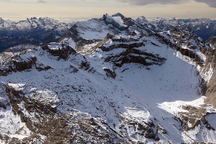 weiten Wiesenrücken vor der breiten und beeindruckenden Wandflucht