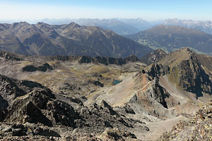 • Mit BW1 weniger beanspruchend, aber landschaftlich vergleichbar lohnend ist eine Tour zum südwestlich gelegenen Hohen Gemeindekopf, 2771m. Dazu vom o.g. Seeauge bei etwa 2495m auf markiertem Pfad südwärts einen begrünten Absatz empor und oben flacher ostwärts durch welliges Gelände in den ausgedehnten Karboden vor der Riegespitze. Dort hinter dem Kugleter See südwärts vorbei ins gut gangbare Trümmermeer links unter dem Gemeindekopf. Weiter oben im Geröll zunehmend rechts haltend in die letzte Scharte (0:45) vor dem Gipfelchen und über einen kurzen, begrünten Grat ans Gipfelkreuz (0:05). Allerdings beträgt die Prominenz nur 20-25m und die Dominanz nur gut 250m (Österreichische Karte 1:50.000), gleichfalls zu wenig für einen Alpengipfel.