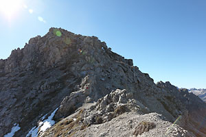 Gipfelkopf. Hier durch eine schattige, nordwestseitige, kurze Rinne (I)