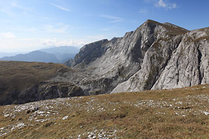 Karsthochfläche. Diese fällt gegen Südosten mit gewaltigen Abstürzen in die