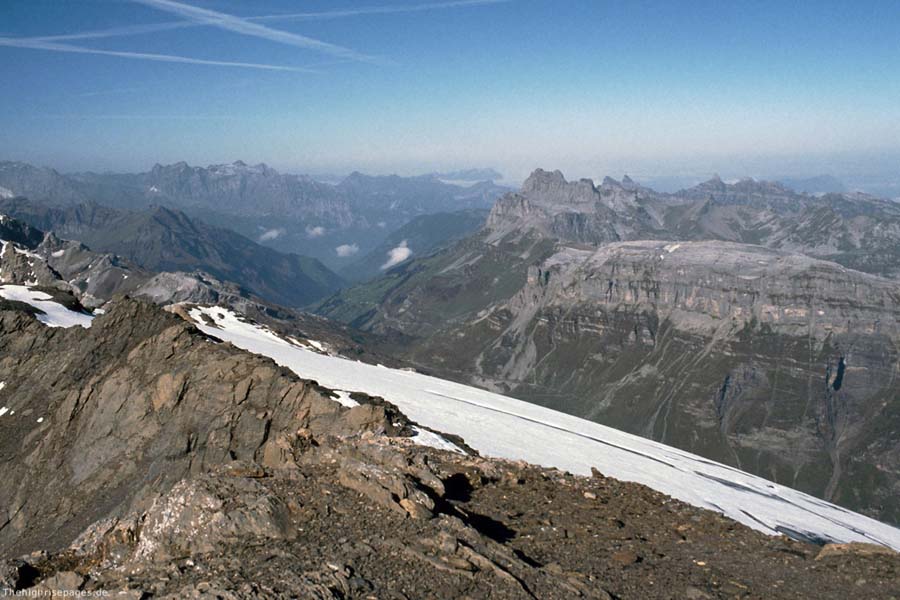 Gemsfairenstock: Links der gewaltige Felskoloss des Tödi, rechts die