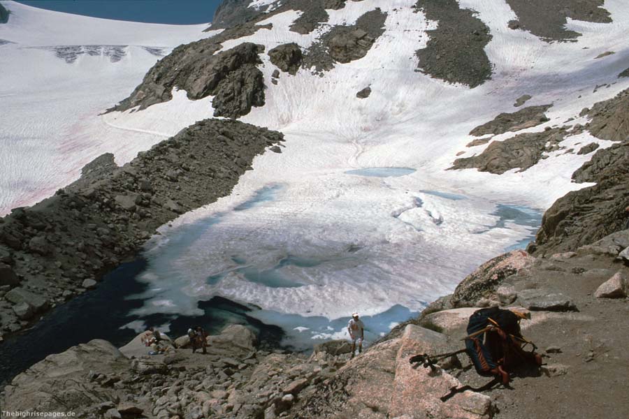 kommt. Darüber im recht steilen Firn nach rechts zur Scharte zwischen