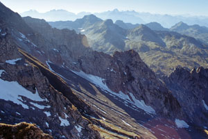 zurück durch die Westflanke. Am Horizont erstreckt sich das Rätikon,