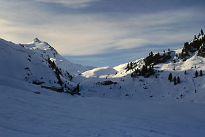 auf eine breite Forststraße stößt. Bei geringer Lawinengefahr diese Straße