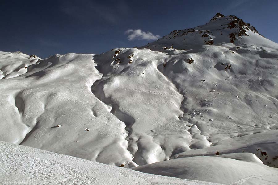 Südflanke (I) überwindet man zu Fuß durch die deutlichste Rinne in der