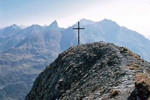 der Roggspitze, über dem Gipfelkreuz erhebt sich die Valluga,