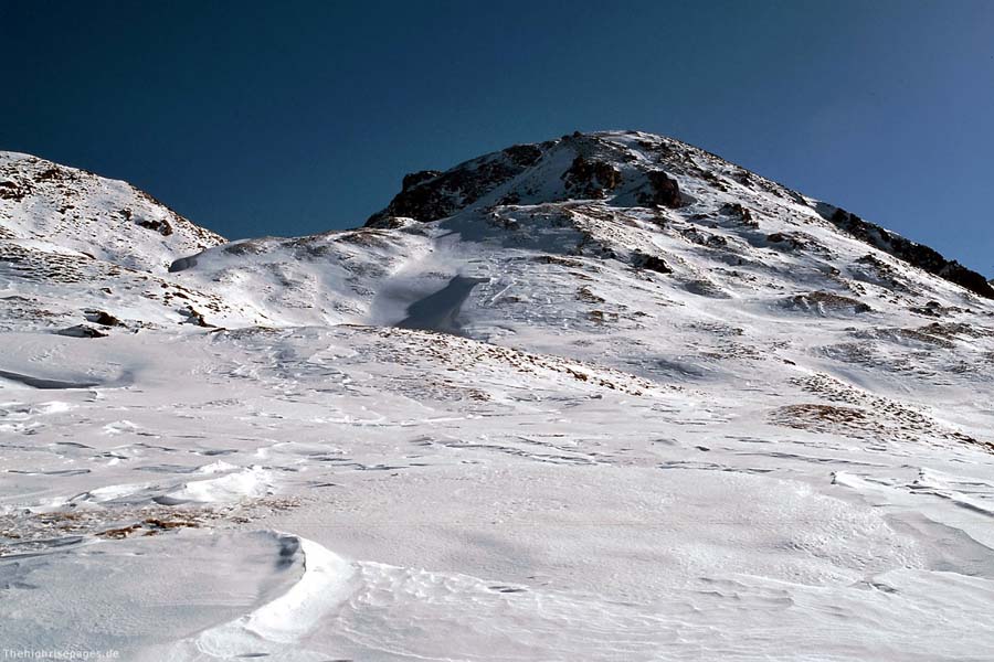 steilen Rinne (etwa 50m) in der Nordwestflanke, zum Schluss über einen