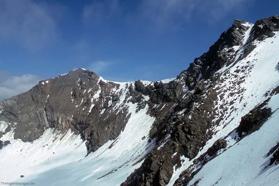 Vorgipfel kann man abkürzend nach rechts die breite, steile Firnrinne direkt