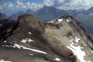 L’Aouille, in der Mitte Cima di Entrelor. Durch das Gletscherbecken rechts