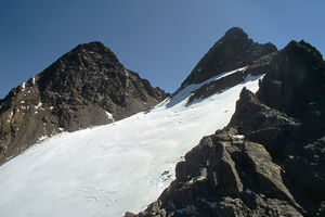 einen Gletschersattel abzusinken. Zu diesem Sattel nun am besten über die