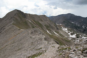 Vom Schrocken nun nach rechts gut 50 Meter hinab (vergl. zweites Bild v.o.) und auf gutem Pfad empor zum gipfelkreuzgeschmückten Ostgipfel der Kreuzspitze. Oben flach weiter über den markanten Felskamm zum etwas höheren Westgipfel (0:25). Darauf schwenkt der weiterhin gut begehbare Felsrücken nach Süden zum behäbigen Felshorn des Hochmölbing (s. drittes Bild) mit Kreuz und Buch, wohin man über einen kaum 30 Meter niedrigeren Sattel gelangt (0:10).
