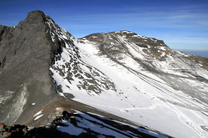 Nun nach links über den Verbindungskamm (Feinschutt) zum etwa 70 Meter