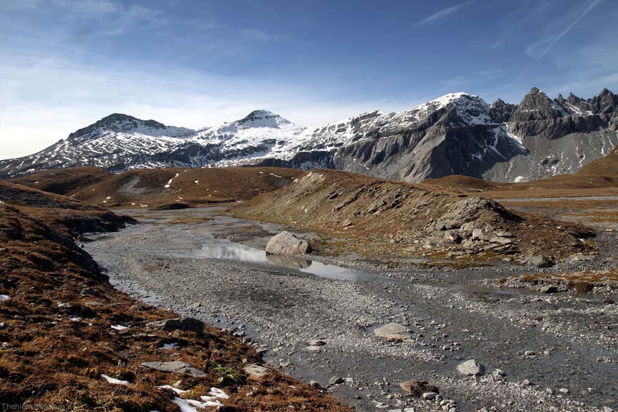 die Talschwelle am Fuße des Kammes Crap la Tgina neben dem Bachauslass. Links an