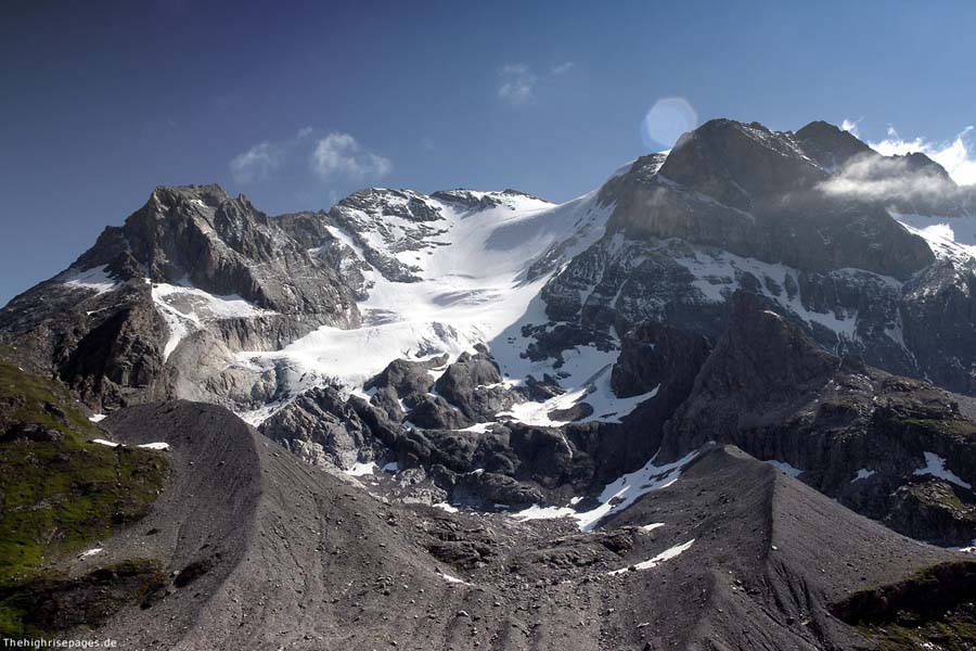 • Eine Erkundung (weitere 0:20) des Zustiegs zu P 3044 scheiterte. Vom Gletscher gelangt man über einen Schuttrücken wenig höher an nordseitige Felswände, wo ein Kamin auf den Gratfirst leiten soll, welcher aber unauffindbar blieb.