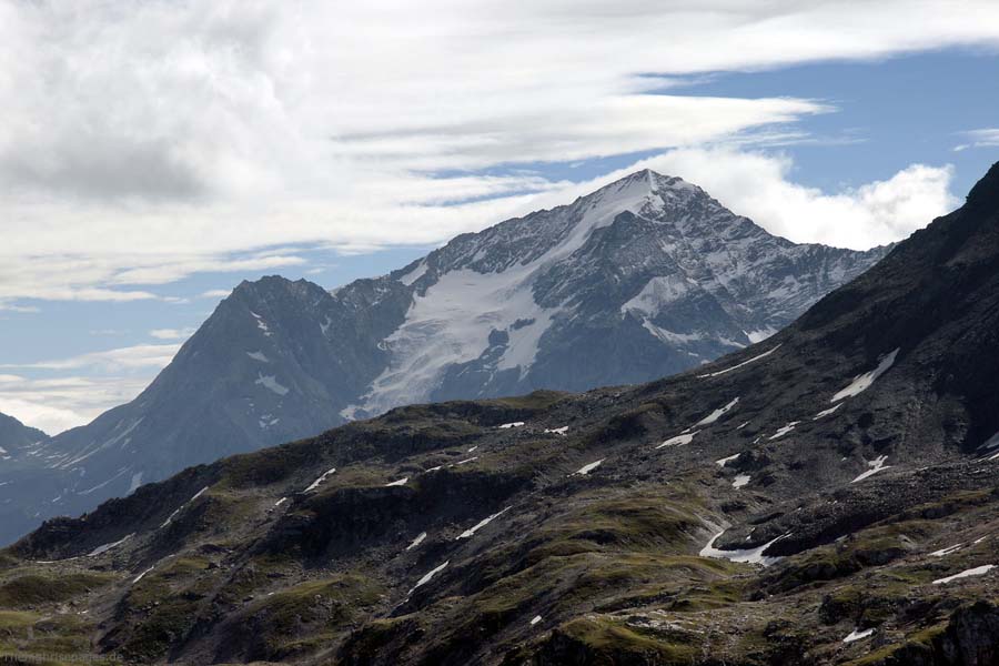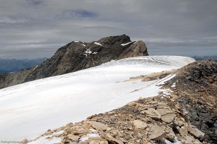 Nun bietet sich ein Abstecher nach Osten zum einst völlig vergletscherten Nebengipfel Dôme de Bellecôte an. Dazu muss man wieder etwas in den beim Zustieg berührten Gletschersattel hinaufsteigen um von dort auf einen ostwärts ziehenden kurzen Gletscherrücken zu gelangen, der einst deutlich höher gewesen sein muss. Nun erweist sich ein dahinter liegender Felsfirst, direkt über den nordseitigen Abstürzen liegend, als höherer Punkt (0:10), der überdies angenehmere Sitzgelegenheiten bietet.