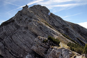 schrofige Absätze hinauf zum höchsten, völlig ungeschmückten Punkt des